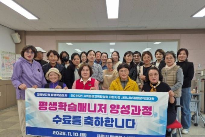 [아시아통신] 사천시는 지역 평생학습 문화의 확산과 학습사회 구현을 위해 운영한 ‘평생학습매니저 양성과정’을 11월 10일 성황리에 마무리하며 수료식을 가졌다. 이번 과정은 2025년 평생학습도시 신규 지정에 따른 지역평생교육활성화지원사업의 하나로 추진된 프로그램으로 지역 평생학습매니저로서 활동할 시민을 양성하기 위해 마련됐다. 교육내용으로는 평생학습매니저의 역할, 평생학습 자원 발굴 및 프로그램 모니터링 등이 포함됐다. ‘평생학습매니저’는 마을·지역 기반 평생학습 프로그램 기획, 운영, 학습동아리 지원, 학습 공간 발굴 등 다양한 평생학습 현장 활동이 가능한 인적 자원이다. 박동식 시장은 “이번 양성과정을 통해 배움의 열정을 가진 시민들이 지역 평생학습 활성화의 주역으로 성장하게 되어 매우 기쁘다. 수료생 한 명 한 명이 사천시 평생학습 문화의 전환점이 될 것이다.”라고 밝혔다. 또한, 시는 이러한 인적 자원을 확보하여 시민 누구나 일상에서 배우고 나누는 ‘학습공동체’ 문화를 조성하고, 사천시가 더욱 활력 있는 평생학습도시로 자리매김하는데 기여할 것으로 기대한다.