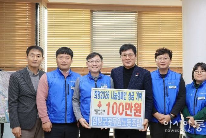 [아시아통신] 전남 함평군공무원노조가 연말연시를 맞아 불우이웃돕기 성금을 기탁하며 지역사회에 따뜻한 정을 전하고 있다. 함평군은 16일 “함평군공무원노조가 연말연시를 맞아 불우이웃을 돕기 위한 성금 100만 원을 기탁했다”고 밝혔다. 함평군공무원노동조합은 노사협력 간담회와 협동 워크숍 등을 통해 공무원의 근무 여건 개선과 상생하는 노사문화 조성을 위해 꾸준히 활동하고 있으며, 조직 내 갈등 해소와 소통 강화, 의견 수렴을 위한 다양한 노력을 이어오고 있다. 이와 함께 지역사회 구성원으로서 지역에서 받은 관심과 성원에 보답하고, 지역 복지 증진에 기여하기 위해 나눔 활동을 지속적으로 실천하고 있다. 정안식 노조위원장은 “어려운 이웃들을 위해 조합원들의 마음을 모아 성금을 마련했다”며 “조합원들의 따뜻한 마음이 어려운 이웃들이 추운 겨울을 이겨내는 데 힘이되길 바란다”고 말했다. 이어 “앞으로도 함평군 지역사회 발전에 기여할 수 있는 노동조합이 되도록 노력하겠다”고 덧붙였다. 함평군은 “지역사회를 위한 따뜻한 나눔을 실천해주신 함평군공무원노조 조합원 여러분들께 깊이 감사드린다”며 “기탁해주