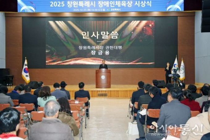 [아시아통신] 창원특례시는 23일 시청 시민홀에서 ‘2025 창원특례시 장애인체육상 시상식’을 개최했다. 이번 시상식은 2025년 한 해 동안 각종 대회에서 우수한 성적을 거둔 선수들과 장애인체육 발전에 기여한 관계자·봉사자들의 노고를 격려하고 감사의 뜻을 전하기 위해 마련됐다. 이날 행사에는 장금용 창원특례시장 권한대행을 비롯해 권성현 창원특례시의회 부의장, 장애인체육회 가맹단체 및 유관기관 관계자 등 100여 명이 참석해 한 해를 마무리하는 뜻깊은 시간을 가졌으며, 장애인체육 발전 유공자 23명에게 표창이 수여됐다. 2025년 창원시장애인체육회는 시장배·협회장배 대회와 어울림 걷기대회 등 자체 대회를 개최하고, 가맹단체의 전국대회 참가를 지원했다. 또한, 생활체육 교실 및 체육동아리 운영, 장애인 생활체육용품 대여 서비스 등 다양한 사업을 추진하며 한 해 일정을 성공적으로 마무리했다. 특히, 창원시청 휠체어컬링팀은 2025년 전국 장애인 동계체전에서 2관왕을 차지하는 눈부신 성과를 올렸다. 장금용 창원특례시장 권한대행은 “2025년 한 해 동안 창원시 장애인체육 발전을 위해 노고를 아끼지 않으신
