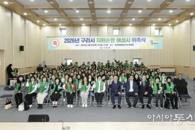 [아시아통신] 구리시는 지난 2월 5일 구리시 여성행복센터 대강당에서 2026년 구리시 자원순환 해설사 위촉식을 개최했다. 이날 위촉식에는 2026년 한 해 동안 자원순환 해설사로 활동할 해설사 168명이 참석했다. 구리시 자원순환 해설사는 구리시 자원순환 교육센터에서 운영하는 해설사 양성과정을 수료한 후 위촉되며, 찾아가는 자원순환 교육을 비롯해 공동주택 분리배출 계도·홍보, 다량 배출사업장 지도·점검 등 다양한 자원순환 활동에 참여하고 있다. 자원순환 해설사는 지역사회를 이끌어갈 자원순환 분야의 핵심 리더로서, 생활 속 올바른 생활폐기물 분리배출 실천부터 자원 절약과 재활용 문화 정착을 위한 시민 대상 자원순환 교육까지 폭넓은 임무를 수행할 예정이다. 백경현 구리시장은 “올해부터 수도권 매립지 생활폐기물 직매립이 금지되면서 각 지자체의 폐기물처리에 대한 고민이 더욱 깊어지고 있다”라며 “자원을 최대한 재활용할 수 있도록 변화하는 분리배출 방법에 대한 시민 홍보에 최선을 다해 달라”고 당부했다. 이어 “시에서도 자원순환 해설사 활동이 안정적으로 이뤄질 수 있도록 지속적인 관심과 지원을 아끼지 않겠