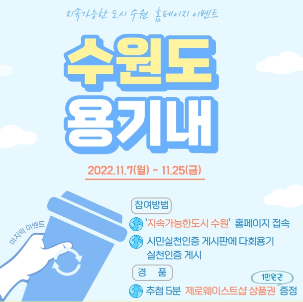 11월 7일부터 25일까지 수원시 홈페이지에서 ‘시민참여→지속가능한 도시 수원’이나 ‘시민참여 배너→지속가능한 도시 수원 이벤트 배너’로 접속해 ‘시민실천인증’ 게시판에 다회용기 사용 실천 인증 사진을 게시하면 된다.