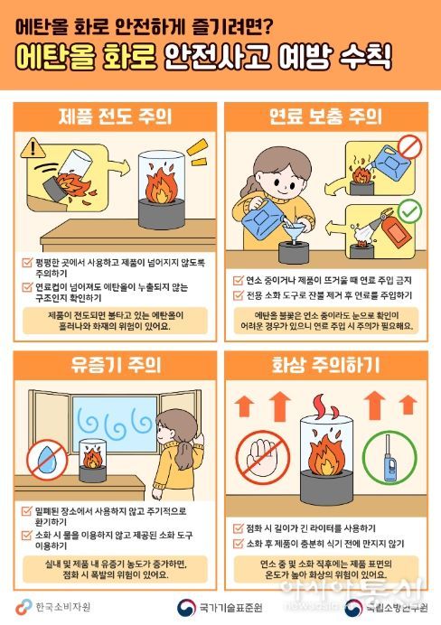 이에 국표원, 소방연구원 및 소비자원은 에탄올 화로의 안전한 사용을 위해 평평한 곳에서 사용하고 제품이 넘어지지 않도록 주의하고, 연소 중이거나 뜨거울 때 연료 보충하지 않을 것, 물을 이용하여 소화하지 않고 전용 소화 도구를 이용할 것, 주기적인 환기를 실시하고 밀폐된 장소에서 사용하지 않을 것 등을 당부했다.