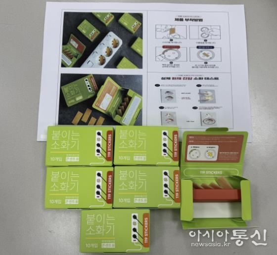 화재예방스티커는 콘센트에 부착하면 전기 화재 발생 시 인체에 무해한 친환경 소화약제가 분출되어 초기에 화재 진압이 가능하여 실내에서 발생할 수 있는 전기 화재 사고를 예방할 수 있는 혁신 제품이다.