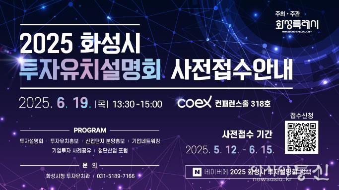 [아시아통신] 화성특례시가 오는 6월 19일 서울 코엑스에서 ‘2025 화성시 투자유치 설명회’를 개최하며, 이에 앞서 5월 12일부터 6월 15일까지 사전접수를 진행한다고 밝혔다.