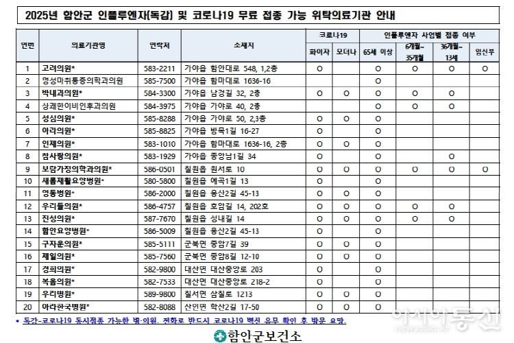 접종이 가능한 위탁 병의원 목록은 관내 마을 경로당 등 500여 군데에 게시되어 있으며, 함안군청 누리집 새소식에서 확인할 수 있다.
