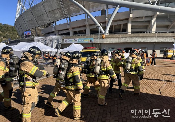 올해 훈련은 진주종합경기장에서 경기장 붕괴 및 화재로 인한 인파사고를 재난유형으로 선정해 진행됐다. 진주종합경기장 서북쪽에서 가스 누출로 화재가 발생하고 가스 저장탱크가 폭발해 경기장 일부가 붕괴돼 대피 중 다중밀집으로 인파사고가 발생한 상황을 설정했다.