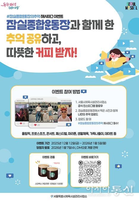 [아시아통신] 서울시 체육시설관리사업소는 잠실종합운동장에서 시민이 경험한 다양한 추억과 기억을 수집하기 위한 SNS 이벤트 '#잠실종합운동장의 추억 해시태그 이벤트'를 2026년 1월 5일까지 진행한다고 밝혔다.