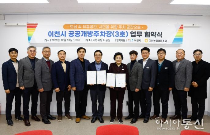 이천시는 12월 18일, 이천시장과 이천농업협동조합장이 참석한 가운데 공공개방주차장 조성 및 운영에 관한 협약식을 개최하고, 중리동 496-12번지 일원에 공공개방주차장을 조성하기로 했다.