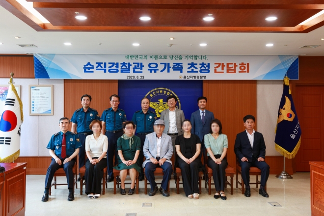 울산지방경찰청(청장 김진표)에서는 6. 23.(화) 15:00 순직경찰관 5명(故 경사 이병일, 경사 노금환, 경장 김태우, 경위 박준철, 경감 김동률)의 유가족 6명을 초청하여 김진표 청장을 비롯한 경찰지휘부가 참석한 가운데 간담회를 가졌다. 이 날 간담회는 6월 호국보훈의 달을 맞아 순직경찰관 유가족들을 초청하여 고인의 숭고한 뜻을 기리고 격려하는 시간을 갖기 위해 마련된 것으로, 유가족들의 ‘울산경찰 추모의 공간 참배’에 이어 회의실에서 추모 영상 시청 및 환담의 시간, 순으로 진행되었다. 김진표 청장은 이 자리에서 인사말을 통해 “국가를 위해 떠나신 분들의 빈자리를 대신해 시련과 역경을 이겨낸 유가족 여러분께 깊은 존경과 위로의 말씀을 드리며, 코로나19 감염이 위중한 시기에 이렇게 건강한 모습을 뵙게 되어 감사한 마음”이라는 인사말과 함께, “순직경찰관과 유가족들의 명예와 자부심을 높여드리는 따뜻한 보훈을 실천해 나가겠다.”고 밝혔다. 이에 유가족 측은 “바쁜 여건 속에서도 순직경찰관의 유가족을 잊지 않고 초청해준 데 대해 고마움을 표시하면서, 국가를 위해 목숨을 잃은 경찰관들의 희생이 헛되지 않도록 힘써달라.”고 당부했다.