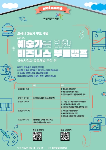 [아시아통신] (재)화성시문화재단은 지역 예술인이 변화하는 예술 시장과 유통 채널을 이해하고 대응할 수 있도록 기획된 지역 예술인 교육 프로그램 ‘예술가를 위한 비즈니스 부트캠프’를 동탄복합문화센터에서 6월 4일부터 운영한다.