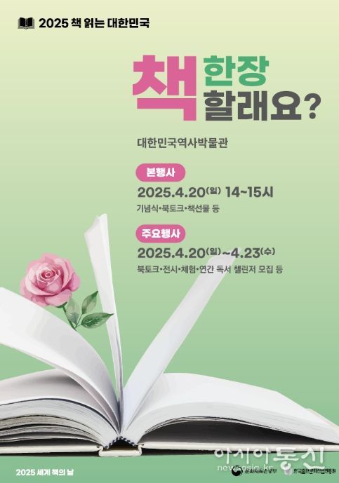 ‘책 읽는 대한민국’ 캠페인의 시작을 알리는 다양한 행사도 대한민국역사박물관 1층과 야외 역사 마당에서 열린다. ‘북클럽 성향분석존’과 ‘북클럽 안내존’을 마련해 개인별 성향 분석을 통한 맞춤형 ‘북클럽’을 추천한다. ‘북멘토 서재전’에서는 ‘북멘토’가 추천하는 책을 살펴볼 수 있고, ‘한 장 추천 도서전’과 ‘한 장 오디오북존’에서는 지역과 온라인 서점, 도서관 등이 추천한 책을 보고 소리책(오디오북)을 체험할 수 있다. ‘한 장 그림책전’에서는 어린이와 가족 단위 방문객들이 2023년과 2024년 대한민국 그림책상 수상 도서를 감상하고 컵방울 만들기 등 그림책 속 활동을 체험할 수 있다. 포스터를 찍어 인스타그램에 올리고 4월 23일까지 안내소에서 인증하면 추첨을 통해 100명에게 ‘커피 기프티콘’도 증정한다.