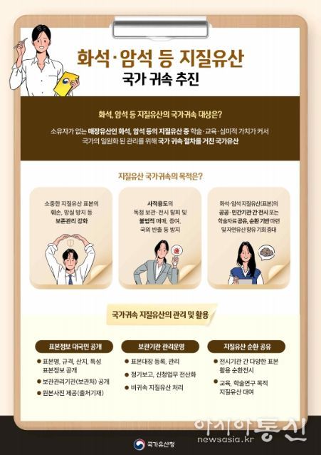 국가유산청은 2020년부터 국공립기관과 대학, 사립기관, 개인 소장자가 보유한 화석이나 암석 같은 지질유산 보유현황을 전수조사하고, 이를 ‘지질유산 표본정보서비스’에 등록하는 지질유산 데이터베이스 구축사업을 수행하고 있다. 관계 전문가의 현장 실사와 가치평가를 통해 각 지질유산에 대한 국가귀속 여부를 판단하며, 최종 국가귀속된 지질유산은 지정된 보관관리기관에서 보존·관리되고, 필요시 추후 건립될 국립자연유산원에서 교육·전시 등을 위한 자원으로 활용될 예정이다. 또한, 국가유산청은 관련 학회, 연구기관과의 긴밀한 협력을 통해 학술적·교육적 활용도 지원할 예정이다.
