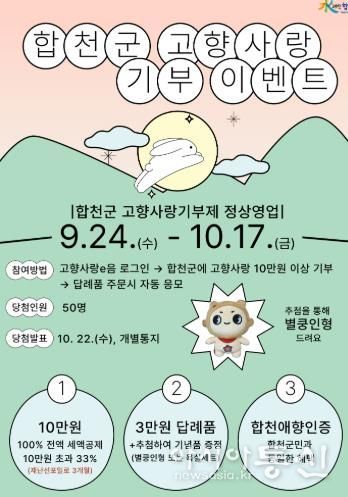 [아시아통신] 합천군은 민족 최대 명절인 추석을 맞아 고향사랑기부제 참여 분위기를 확산하고, 건전한 기부 문화 정착을 위해 '추석맞이 고향사랑기부제 기념품 증정 이벤트'‘합천군 고향사랑기부제 정상영업 합니다’를 추진한다.