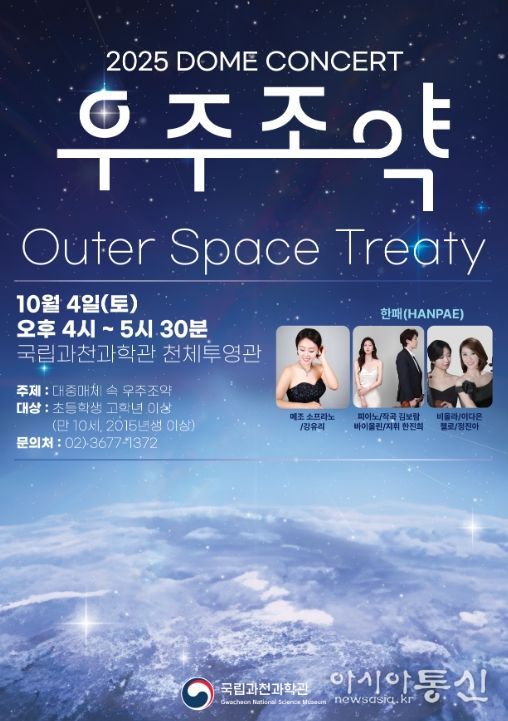 [아시아통신] 과학기술정보통신부 국립과천과학관은 세계 우주 주간을 맞아 오는 10월 4일 오후 4시, 천체투영관에서 돔 토크 콘서트 '대중매체 속 우주 조약'을 개최한다고 밝혔다.