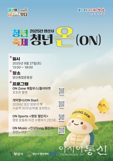 [아시아통신] 양산시는 청년의 날과 청년주간을 맞아 오는 27일 오후 1시부터 양산종합운동장에서 '2025 양산시 청년축제 ‘청년 온(ON)’'을 개최한다고 밝혔다.