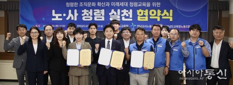 [아시아통신] 전라남도교육청은 30일 청사 비즈니스실에서 전남교사노동조합, 전라남도교육청노동조합과 ‘청렴 실천 협약(MOU)’을 맺고 청렴한 조직문화 확산과 미래세대 청렴교육 강화를 약속했다.