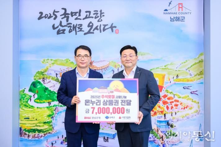 [아시아통신] 남해군은 지난 30일 BNK경남은행 남해지점이 추석 명절을 앞두고 700만원 상당의 온누리상품권을 기탁했다고 밝혔다.
