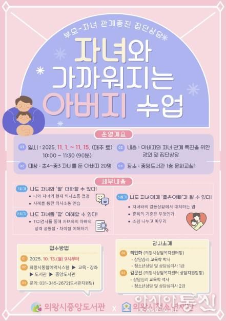 [아시아통신] 의왕시 중앙도서관은 사춘기 자녀와의 관계에서 어려움을 겪고 있는 아버지를 위한 부모 집단상담 프로그램 ‘자녀와 가까워지는 아버지 수업’을 운영한다.