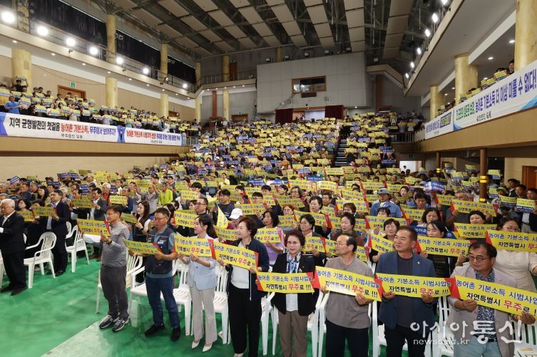 [아시아통신] 무주군이 지난 1일 무주예체문화관 대강당에서 농어촌 기본소득 시범사업 선정을 촉구하는 범군민 결의대회를 개최했다.