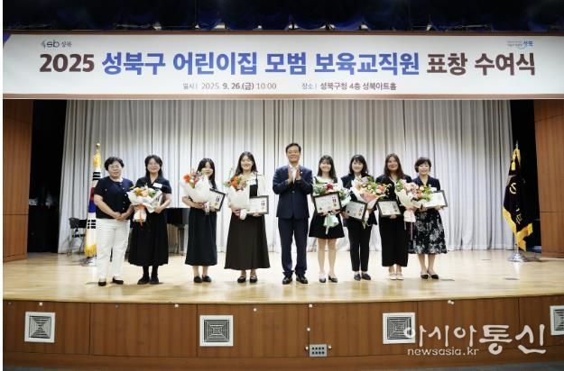[아시아통신] 서울 성북구가 지난 26일 관내 어린이집에서 장기간 근무하며 보육서비스 향상과 우수 보육프로그램 개발, 보육환경 개선에 기여한 모범 보육교직원에게 표창을 수여했다. 올해 수상자는 원장, 보육교사, 조리사 등 총 77명으로, 각자의 자리에서 아이들의 안전과 건강, 교육의 질 향상에 힘써온 공로를 인정받았다.