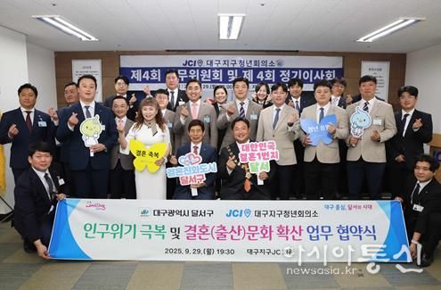 [아시아통신] 대구 달서구는 지난 29일 대구지구청년회의소(회장 이성범)와 초저출생 인구 위기 극복 및 긍정적 결혼문화 확산을 위한 업무협약을 체결했다.