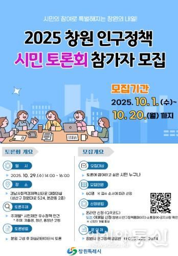 [아시아통신] 창원특례시는 ‘시민이 제안한 인구정책을 시민이 직접 사업화 및 고도화 시킨다’는 취지로 오는 10월 29일 ‘2025 창원 인구정책 시민토론회’를 개최하고 이를 위해 10월 1일부터 20일까지 시민 토론참가자를 모집한다고 밝혔다.