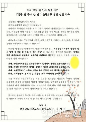 [아시아통신] 충청남도태안교육지원청은 추석 연휴 시기를 맞아 청렴한 공직문화를 확산하기 위해 ‘선물 안 주고 안 받기 운동’을 강조하는 청렴 서한문을 홈페이지에 게시했다.