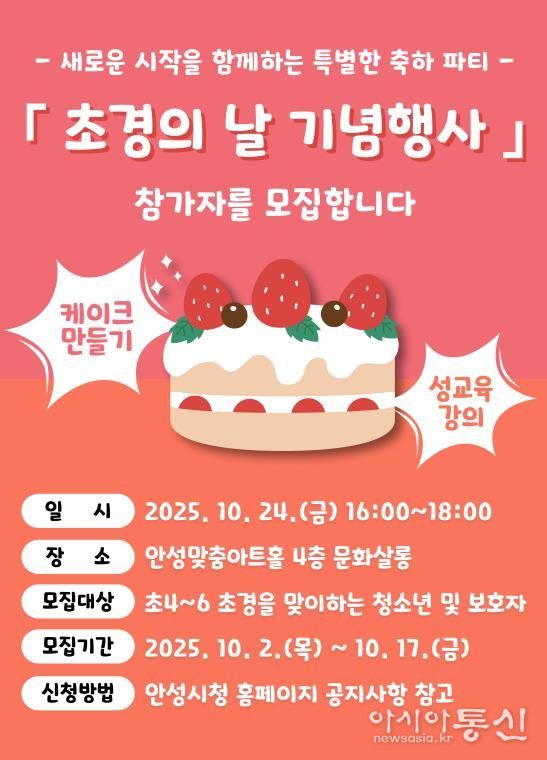 [아시아통신] 안성시는 초경의 날을 맞이하여 오는 10월 24일 금요일 안성맞춤아트홀 4층 문화살롱에서 개최되는 '2025년 초경의 날 기념행사' 참여자를 오늘(2일)부터 모집한다고 밝혔다.