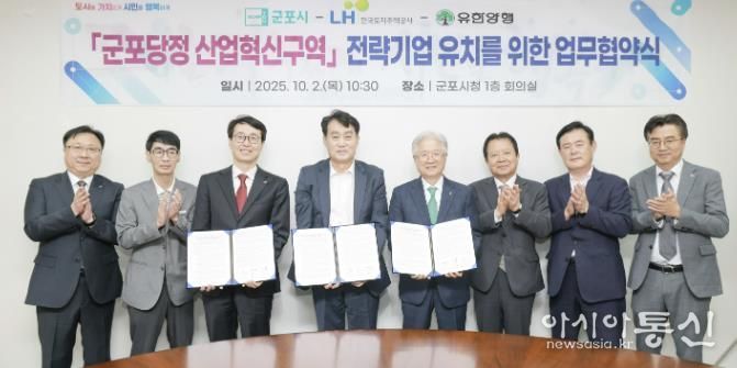 [아시아통신] 군포시는 2일 군포시청에서 한국토지주택공사(LH), ㈜유한양행과 ‘군포당정 산업혁신구역’ R·D 전략기업 유치를 위한 업무협약을 체결했다고 밝혔다.