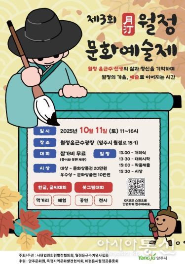 [아시아통신] (사)회천발전협의회와 월정윤근수기념사업회가 공동 주최하는 ‘제3회 양주 월정문화예술제’가 오는 10월 11일 오전 11시 월정 윤근수 광장(양주시 월정로 15-1)에서 열린다.