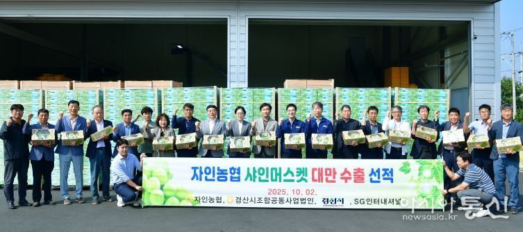 [아시아통신] 경산시는 2일 자인농협 농산물유통센터에서 조현일 경산시장, 조지연 국회의원, 손병한 자인농협장, 포도 공선회원을 비롯한 관계자 30여 명이 참석한 가운데 대만 수출 선적식을 개최했다.