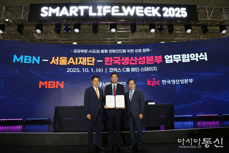 서울AI재단(김만기 이사장)이 지난 10월 1일(수), 코엑스 C홀에서 MBN (매일방송), 한국생산성본부와 공공부문 AI활용 우수사례 발굴 및 확산을 위해 업무협약(MOU)을 체결했다.