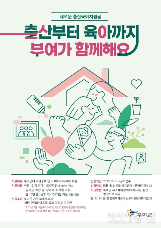 [아시아통신] 부여군이 저출산 위기에 대응하기 위해 기존 출산장려금 제도를 ‘출산육아지원금’으로 전면 개편하고, 오는 10월 13일부터 신청을 시작한다.