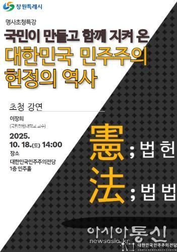 [아시아통신] 창원특례시는 오는 10월 18일 오후 2시, 대한민국민주주의전당 민주홀에서 ‘대한민국 민주주의 헌정의 역사’ 특별 강연을 개최한다고 밝혔다.