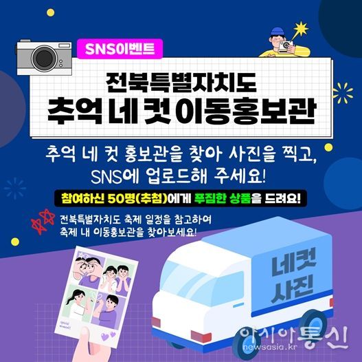 [아시아통신] 전북특별자치도는 10월 10일부터 11월 1일까지 도내 주요 축제 현장에서 ‘추억 네 컷 이동홍보관’을 운영한다고 밝혔다.