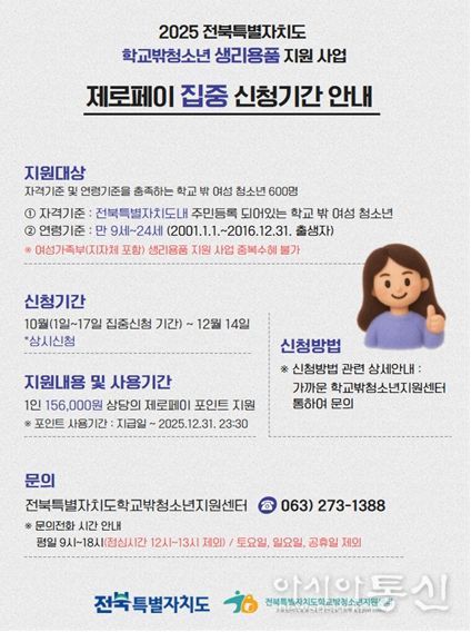[아시아통신] 전북특별자치도가 경제적 부담을 겪는 학교 밖 여성청소년들을 대상으로 생리용품을 지원하는‘2025년 학교 밖 여성청소년 건강지원사업’을 추진한다.