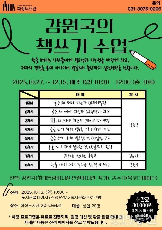 [아시아통신] 고양특례시는 10월 27일부터 12월 15일까지 매주 월요일 오전 10시 30분부터 12시까지, 화정도서관 2층 나눔터1에서 ‘강원국의 책쓰기 수업’프로그램을 운영한다고 밝혔다.