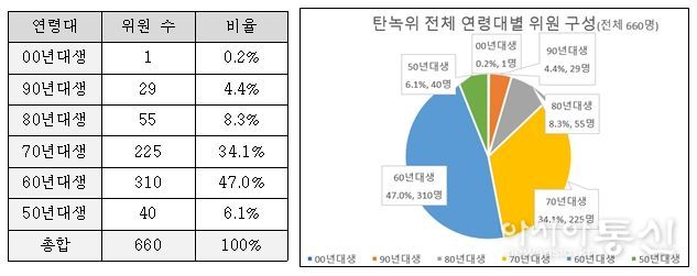 대통령 직속 탄녹위와 지방탄녹위 구성 현황을 출생연대별로 살펴보면, 전체 위원 660명 중 50~70년대생은 575명으로 87.1%를 차지한다. 50년대생(65세~75세)은 6.1%(40명), 60년대생(55세~65세)은 47.0%(310명), 70년대생(45세~55세)은 34.1%(225명)이다. 반면, 80년대생(35세~45세)은 8.3%(55명)이며, 90년대생(25세~35세)은 4.4%(29명)에 그쳤다. 청년 위원은 3.9%(26명)이다. 00년대생은 1명으로, 경상북도 탄녹위 소속이다.