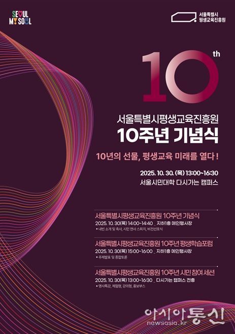 [아시아통신] 서울시평생교육진흥원이 설립 10주년을 맞아 오는 10월 30일 서울시민대학 다시가는 캠퍼스에서 '서울시평생교육진흥원 10주년 기념식'을 개최한다. 이번 행사는 지난 10년의 성과를 되짚고 미래 비전을 제시하는 자리를 넘어, 시민이 직접 참여하고 즐기는 다채로운 축제의 장으로 마련된다.
