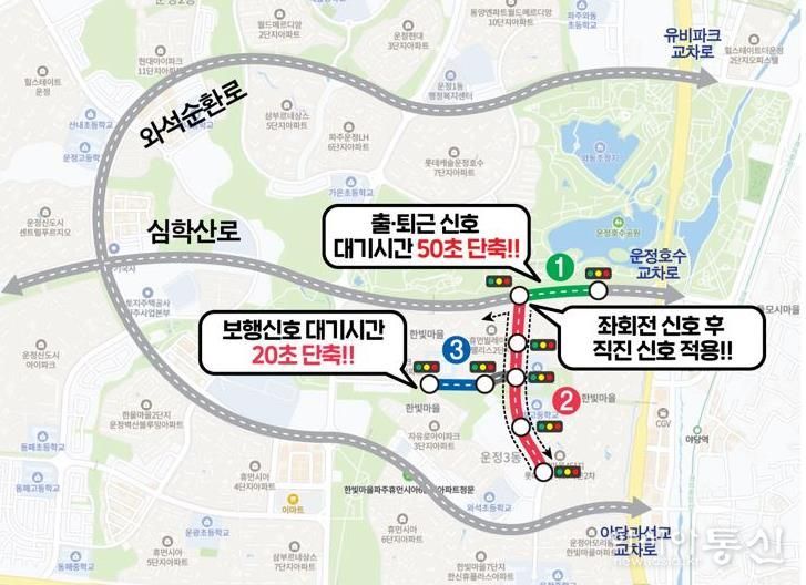 [아시아통신] 파주시는 출퇴근 시간대에 신호주기가 길어 불편했던 운정 한빛마을 5단지 및 2·5단지 소도로 일대 구간의 신호체계를 우선적으로 개선했다고 밝혔다.