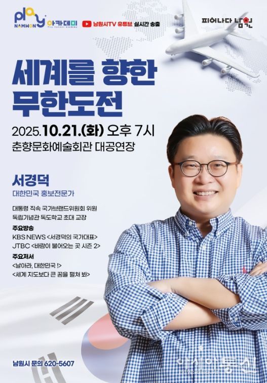 [아시아통신] 남원시는 오는 21일 오후 7시, 춘향문화예술회관 대공연장에서 대한민국 홍보 전문가 서경덕 교수를 초청해 “세계를 향한 무한도전”이라는 주제로 플레이(Play) 남원 아카데미를 개최한다.