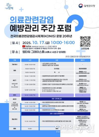 10월 17일에는 의료관련감염 예방관리 주간과 더불어 ‘전국의료관련 감염감시체계(KONIS)’ 운영 20주년을 기념하여 ❶감염관리 관련 학협회 전문가와 현장 관계자들이 참여하는 포럼이 개최된다.