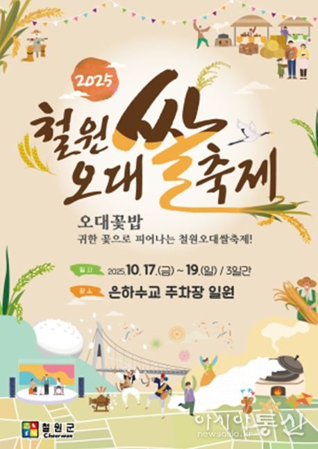 [아시아통신] 철원군은 10월 17일부터 19일까지 3일간 철원군 동송읍 장흥리 2721번지 은하수교 주차장 일원에서 『2025 철원오대쌀 축제』를 개최한다.
