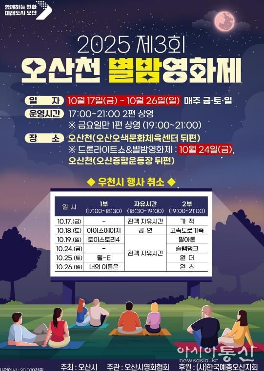 [아시아통신] 오산시는 오는 10월 17일부터 26일까지 매주 금·토·일 저녁, 오산천(오색문화체육센터 뒤편)에서 시민들이 야외에서 영화를 즐길 수 있는 '2025 제3회 오산천 별밤영화제'를 개최한다고 밝혔다.