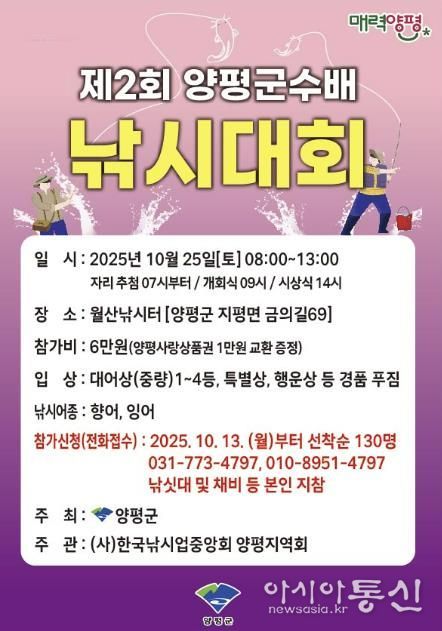 [아시아통신] 양평군은 오는 25일 관내 월산낚시터에서 ‘제2회 양평군수배 낚시 대회’를 개최한다고 밝혔다.