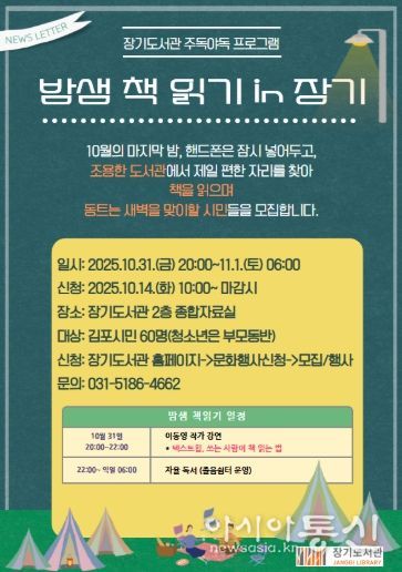 [아시아통신] 김포시 장기도서관은 주독야독 프로그램인 '밤샘 책 읽기 인(in) 장기'를 10월 31일 오후 8시부터 11월 1일 오전 6시까지 장기도서관에서 진행한다고 밝혔다.