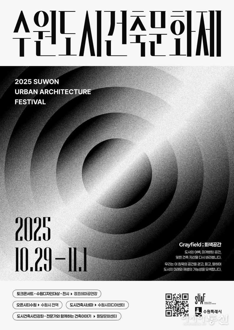 수원특례시(시장 이재준)는 10월 29일부터 11월 1일까지 정조테마공연장, 수원시미디어센터, 팔달문화센터 등에서 ‘2025 수원도시건축문화제’를 연다.