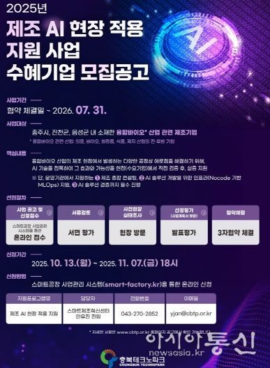 [아시아통신] 충북도는 오는 11월 7일까지 도내 주력산업인 융합바이오 산업과 인공지능(AI) 기술의 융합 촉진을 위한 ‘제조 AI 현장 적용 지원사업’의 참여기업을 모집한다고 14일 밝혔다.