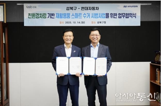 [아시아통신] 서울 성북구 현대자동차와 ‘친환경 차량(ST1) 기반 재활용품 스마트 수거 시범사업’을 위한 업무협약(MOU)을 체결했다. 협약식은 10월 14일 성북구청 구청장실에서 이승로 구청장과 현대자동차 국내판매사업부장 김승찬 전무 등 시범사업 협력업체 관계자들이 참석한 가운데 진행됐다.