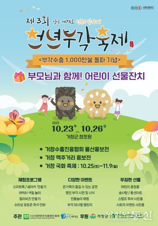 한국 전통 스낵 ‘부각’을 주제로 전시·체험·공연이 어우러진 산업·문화 융합형 축제로, 남녀노소 누구나 무료로 즐길 수 있다. 이번에는 사단법인 대한민국식품명인협회와 ㈜하늘바이오농업회사법인이 공동 주관하고, 거창군과 한국농수산식품유통공사(aT)가 후원한다.